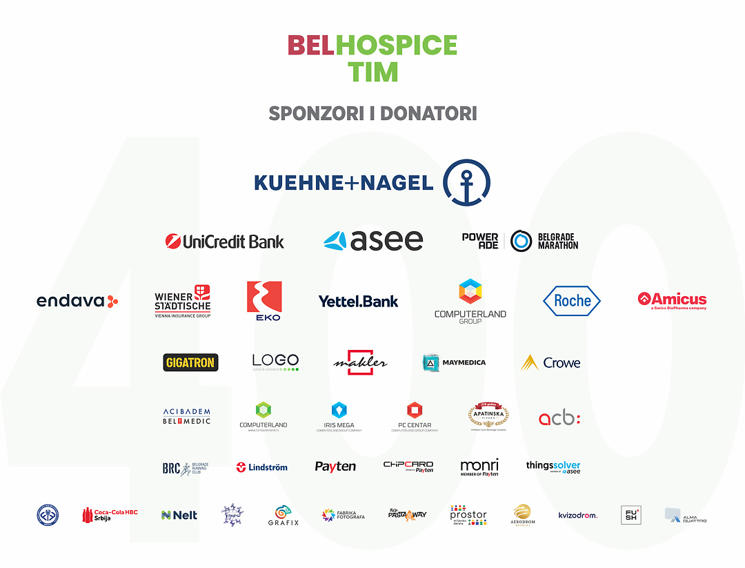 Zahvaljujemo se svim ovogodišnjim sponzorima i partnerima: ACB, AciBadem BelMedic, Amicus, Apatinska pivara, ASEE Group Beograd, Beogradski maraton, Belgrade Running Club, BENU, BlackRock, Blanco, Computerland Group, Crowe, EKO Serbia, Endava, Gigatron, Kuehne+Nagel, Lindstrom, Logo, Makler, Roche, Payten, UniCredit Bank, WIENER STADTISCHE, Yettel bank, Coca-Cola HBC Srbija, Nelt, Grafix, Aerodrom ketering, FUSH, Alma Quattro.